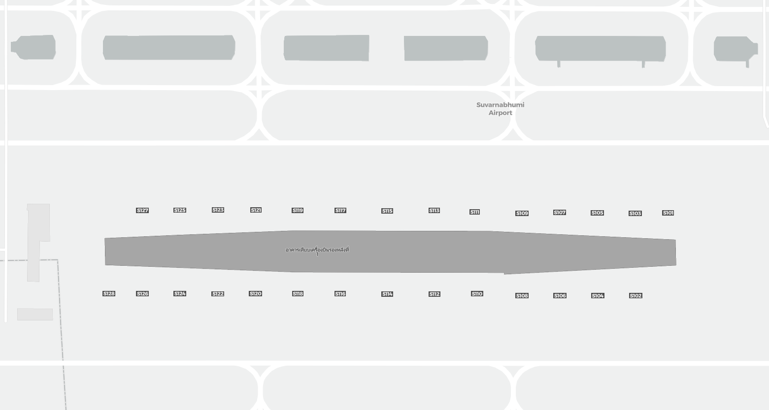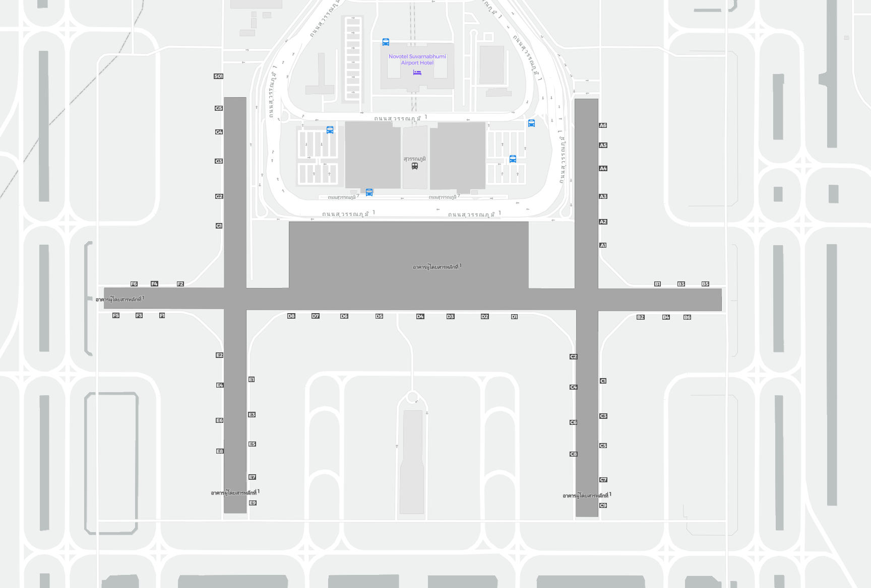 Dit is een inzoombare kaart van Bangkok (BKK). De kaart geeft je een overzicht van het buitenterrein met terminals, parkeerplaatsen, en op sommige luchthavens ook details over gates, autoverhuur en andere voorzieningen bij inzoomen.