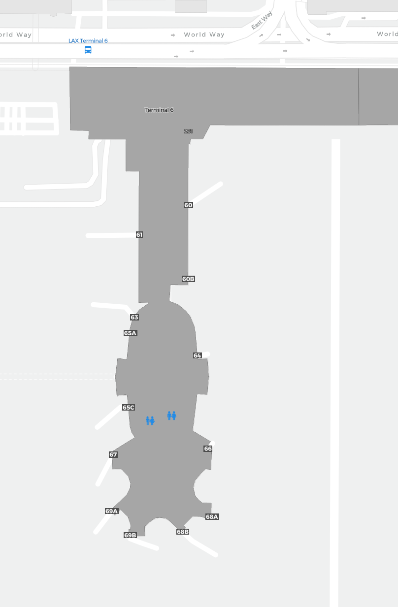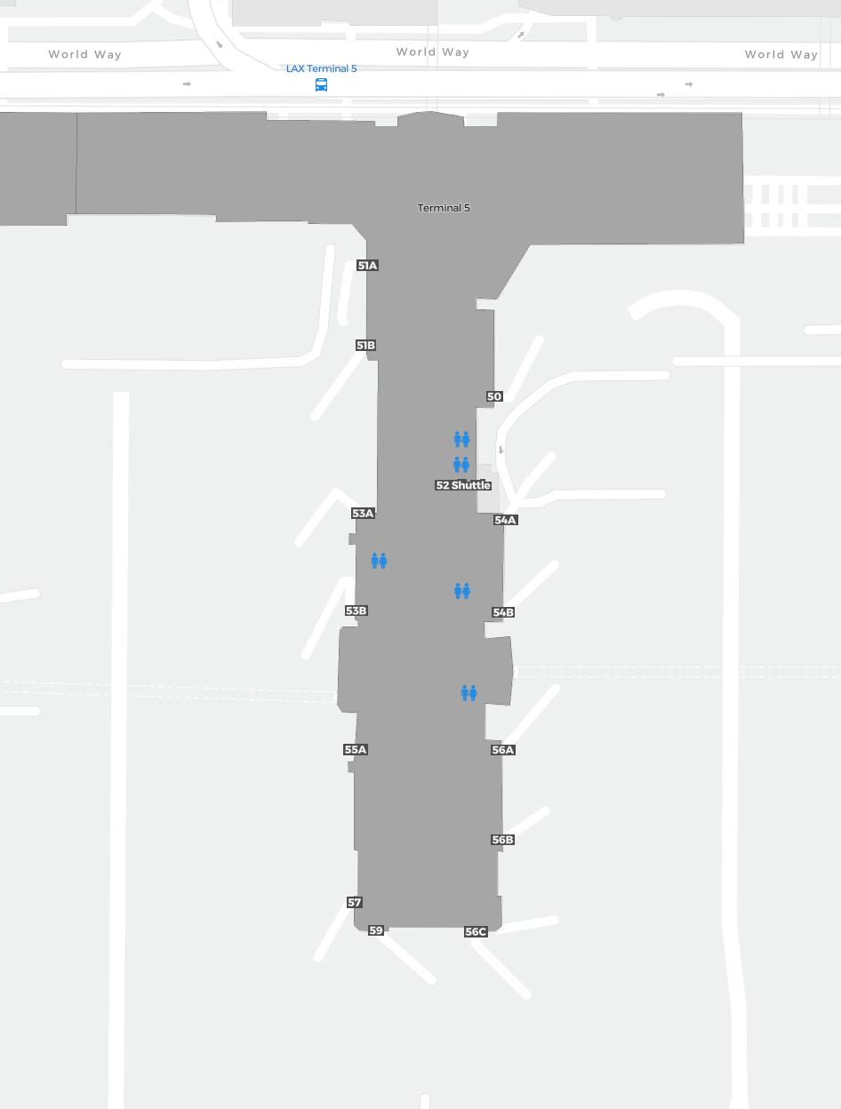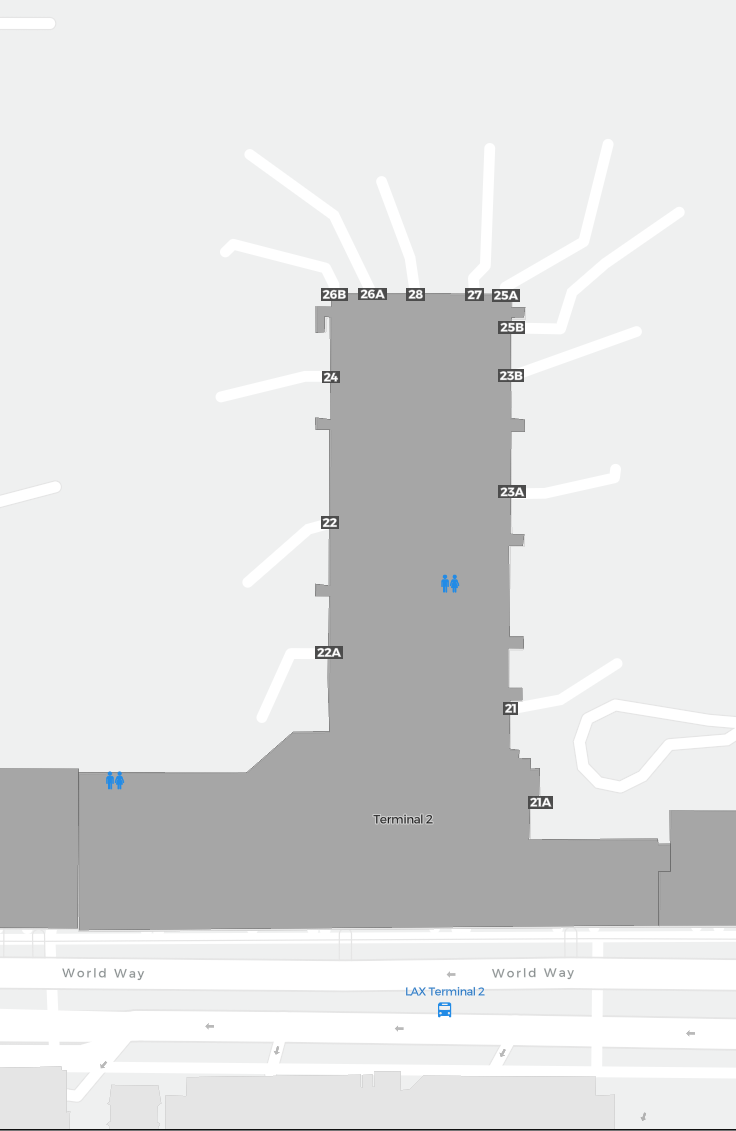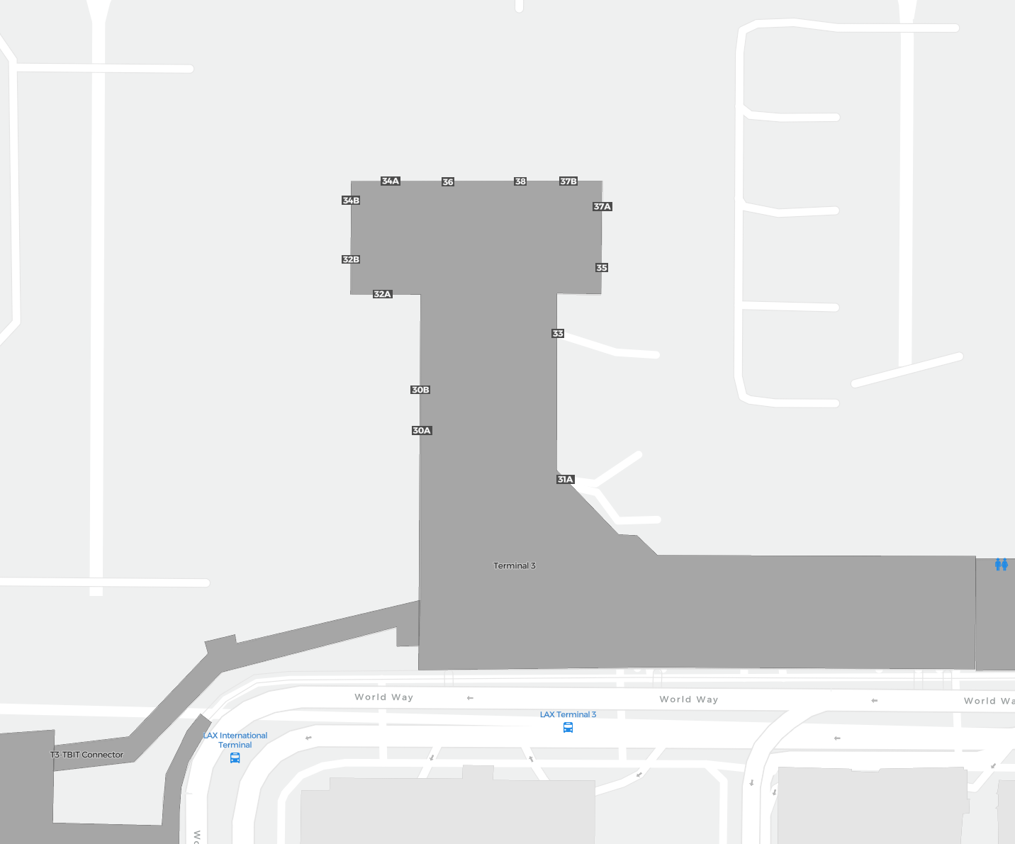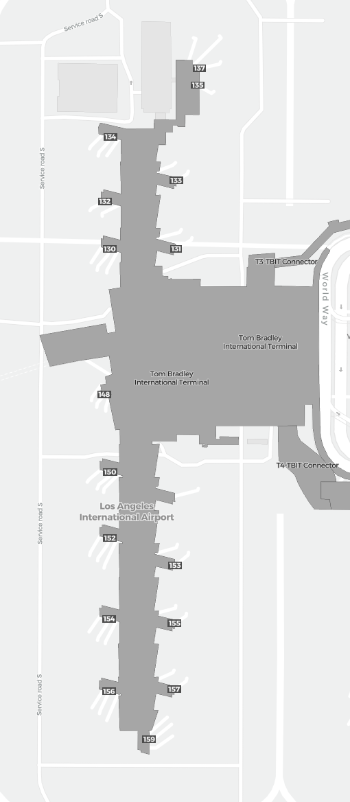 Dit is een inzoombare kaart van Los Angeles (LAX). De kaart geeft je een overzicht van het buitenterrein met terminals, parkeerplaatsen, en op sommige luchthavens ook details over gates, autoverhuur en andere voorzieningen bij inzoomen.