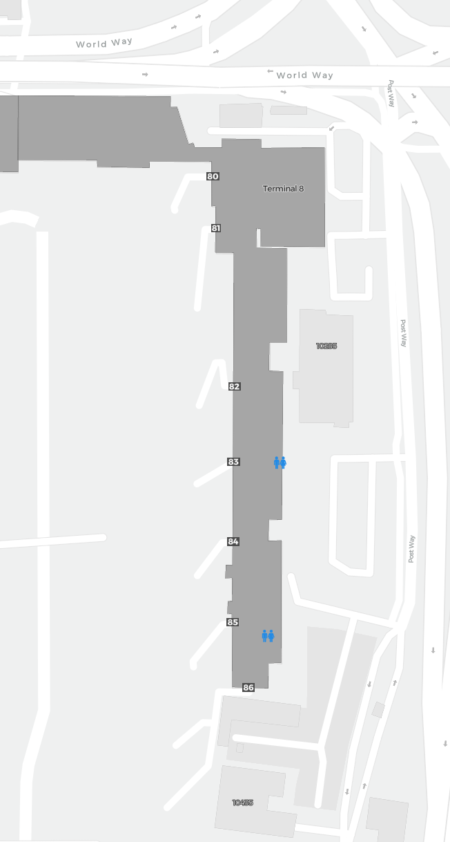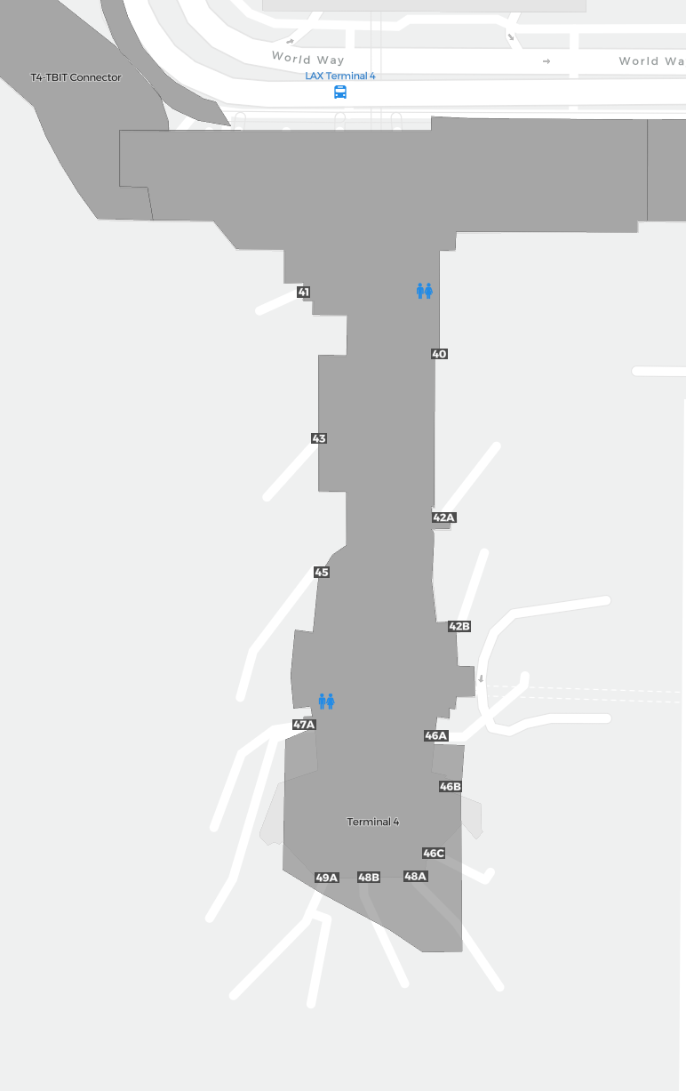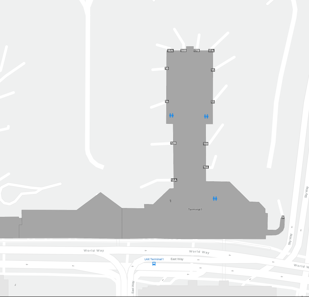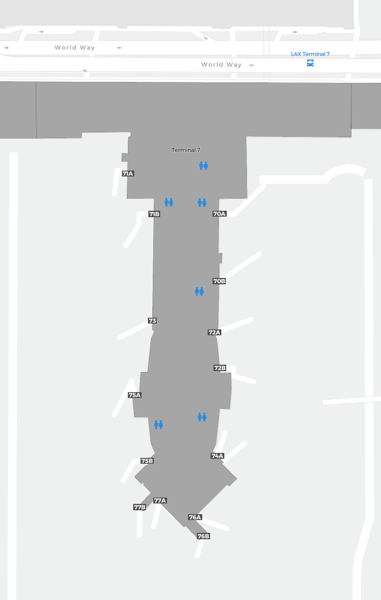 Dit is een inzoombare kaart van Los Angeles (LAX). De kaart geeft je een overzicht van het buitenterrein met terminals, parkeerplaatsen, en op sommige luchthavens ook details over gates, autoverhuur en andere voorzieningen bij inzoomen.