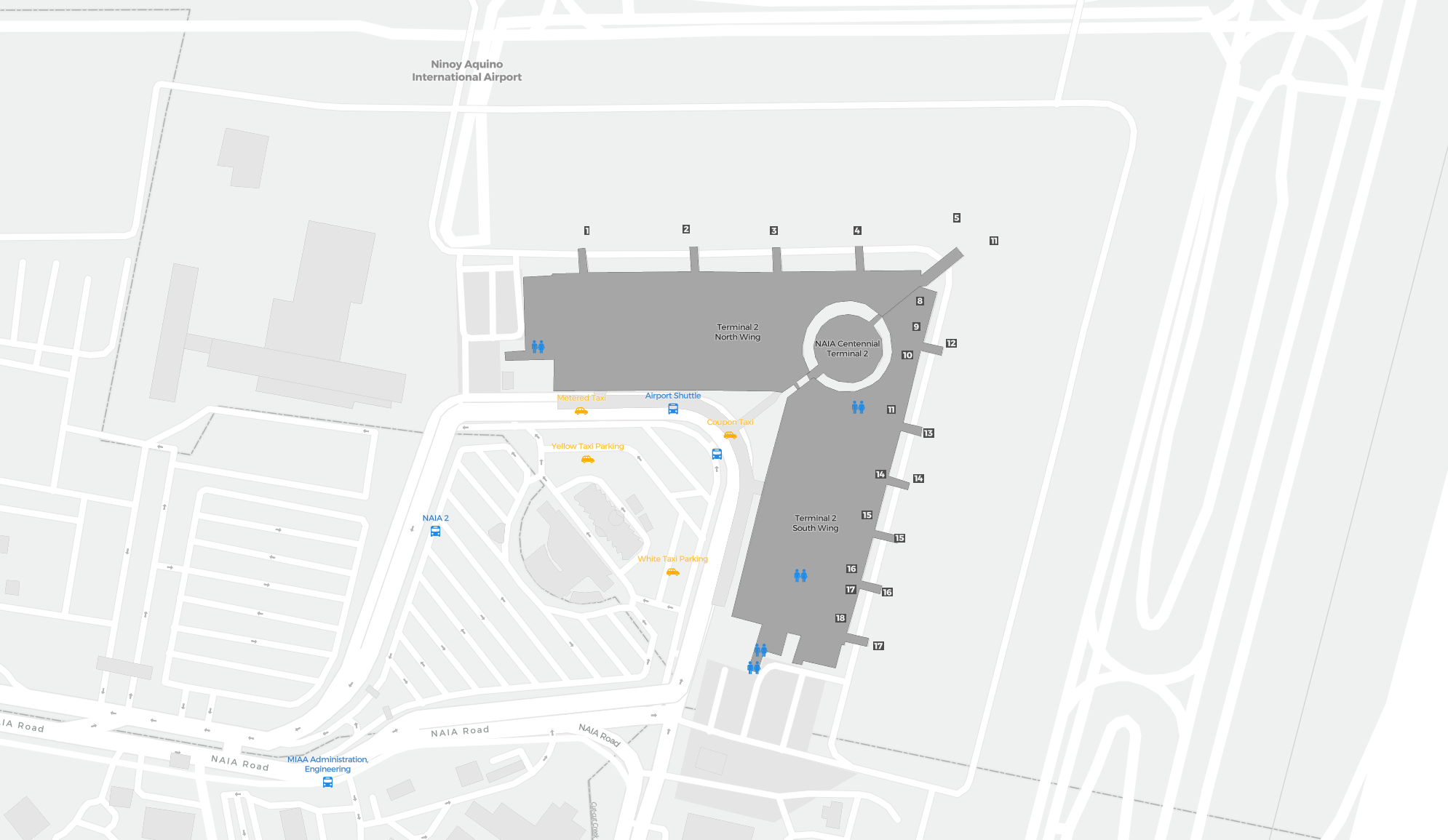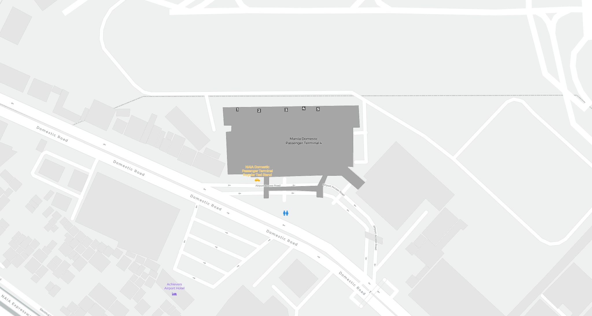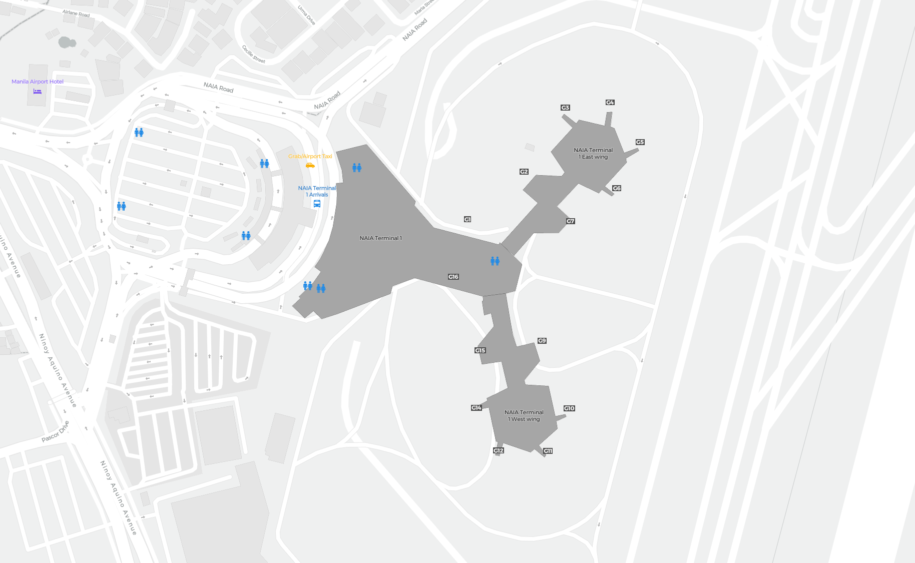 Dit is een inzoombare kaart van Manilla (MNL). De kaart geeft je een overzicht van het buitenterrein met terminals, parkeerplaatsen, en op sommige luchthavens ook details over gates, autoverhuur en andere voorzieningen bij inzoomen.