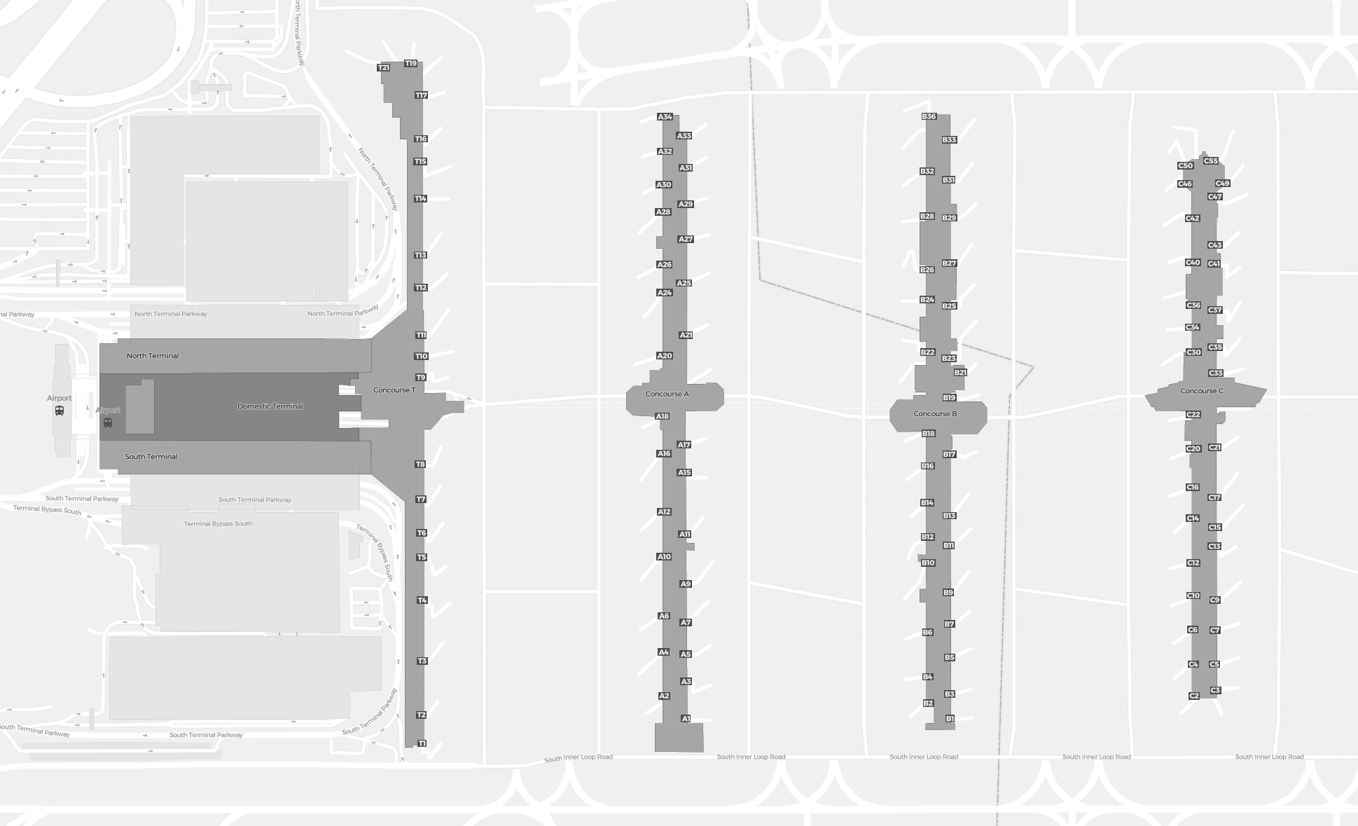 Dit is een inzoombare kaart van Atlanta (ATL). De kaart geeft je een overzicht van het buitenterrein met terminals, parkeerplaatsen, en op sommige luchthavens ook details over gates, autoverhuur en andere voorzieningen bij inzoomen.