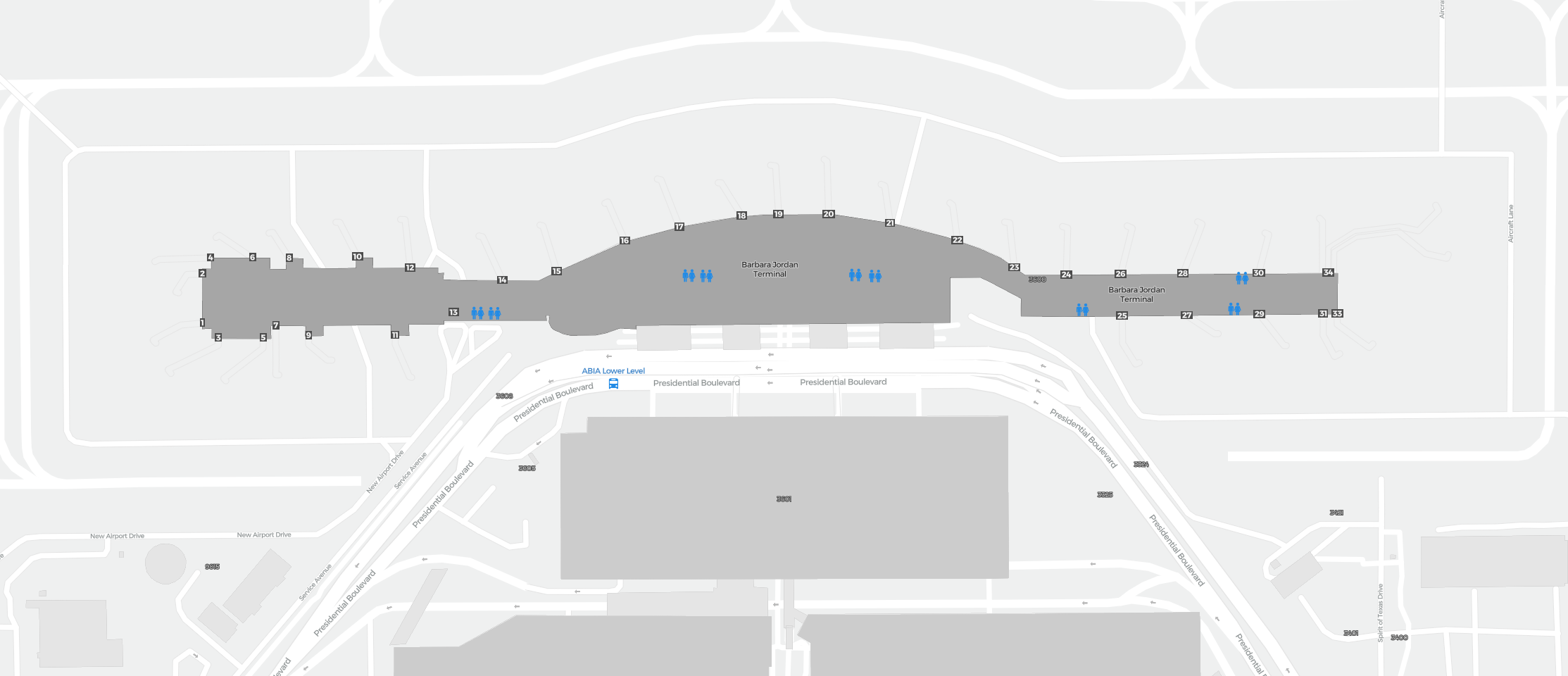 Dit is een inzoombare kaart van Austin (AUS). De kaart geeft je een overzicht van het buitenterrein met terminals, parkeerplaatsen, en op sommige luchthavens ook details over gates, autoverhuur en andere voorzieningen bij inzoomen.