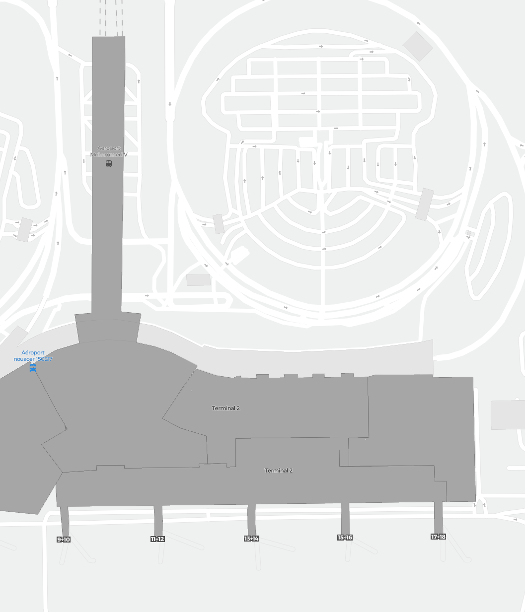 Dit is een inzoombare kaart van Casablanca (CMN). De kaart geeft je een overzicht van het buitenterrein met terminals, parkeerplaatsen, en op sommige luchthavens ook details over gates, autoverhuur en andere voorzieningen bij inzoomen.