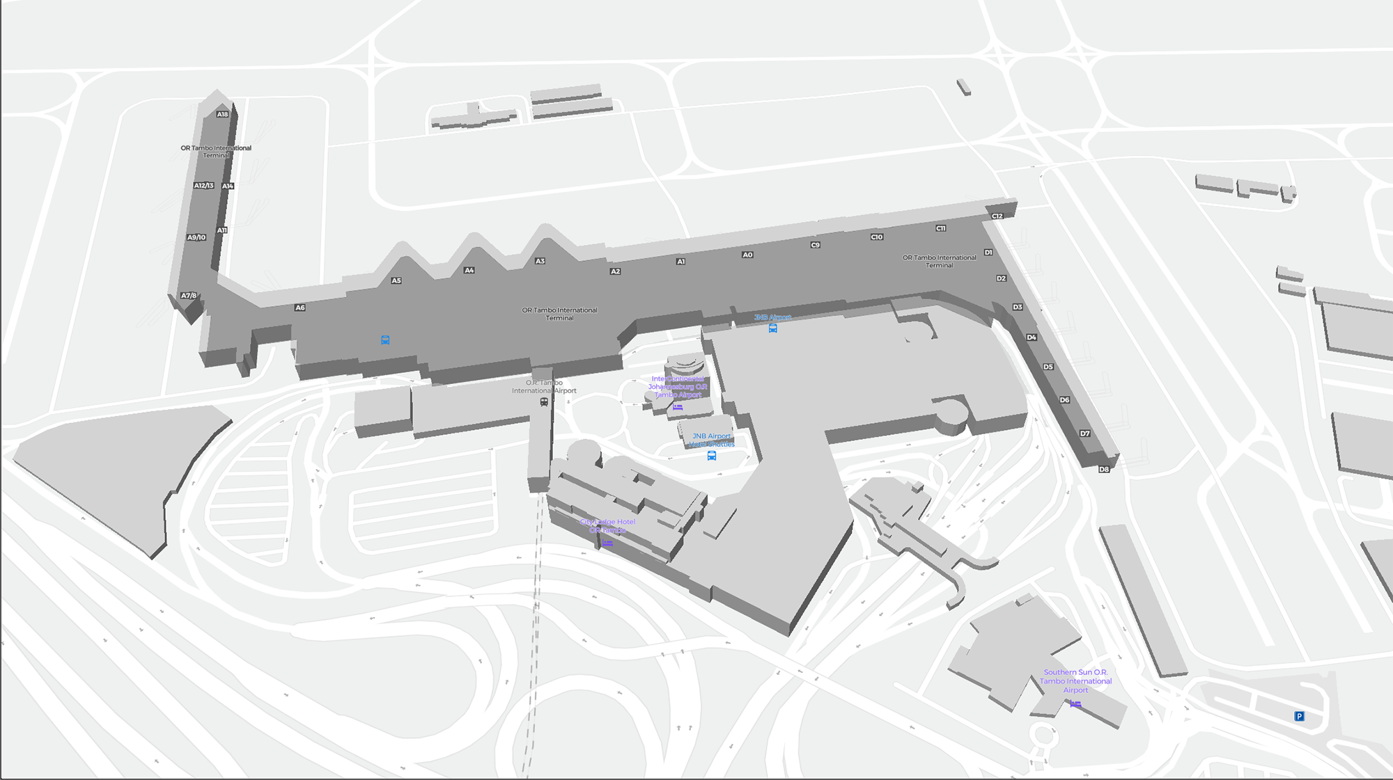 Dit is een inzoombare kaart van Johannesburg (JNB). De kaart geeft je een overzicht van het buitenterrein met terminals, parkeerplaatsen, en op sommige luchthavens ook details over gates, autoverhuur en andere voorzieningen bij inzoomen.