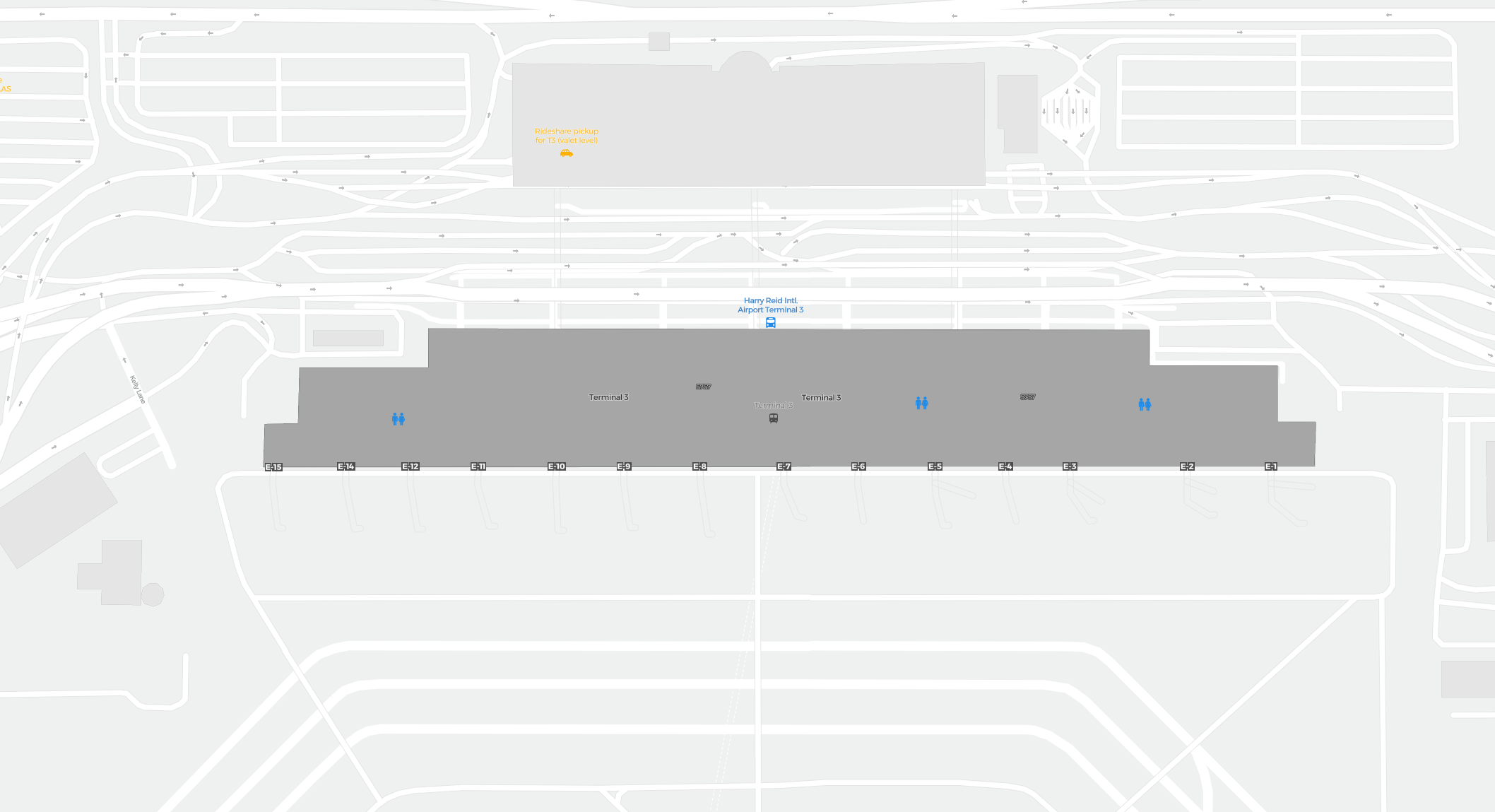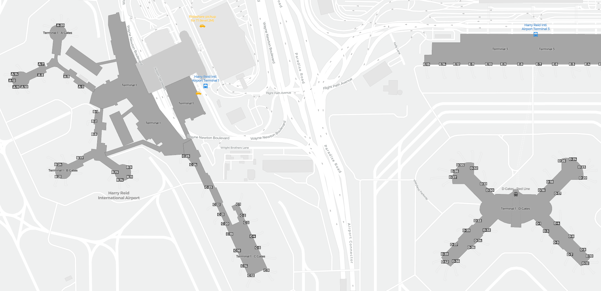Dit is een inzoombare kaart van Las Vegas (LAS). De kaart geeft je een overzicht van het buitenterrein met terminals, parkeerplaatsen, en op sommige luchthavens ook details over gates, autoverhuur en andere voorzieningen bij inzoomen.