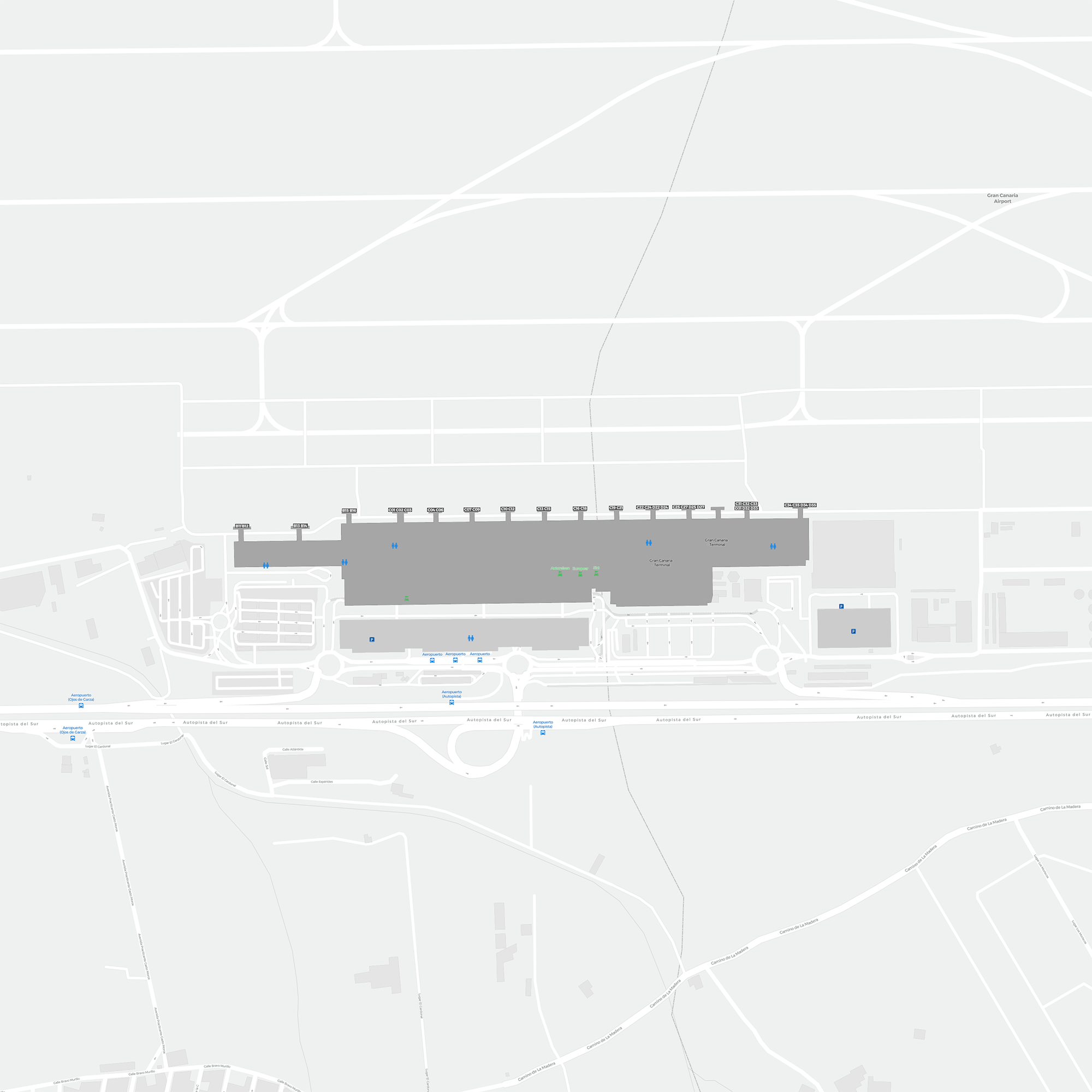 Dit is een inzoombare kaart van Las Palmas de Gran Canaria (LPA). De kaart geeft je een overzicht van het buitenterrein met terminals, parkeerplaatsen, en op sommige luchthavens ook details over gates, autoverhuur en andere voorzieningen bij inzoomen.