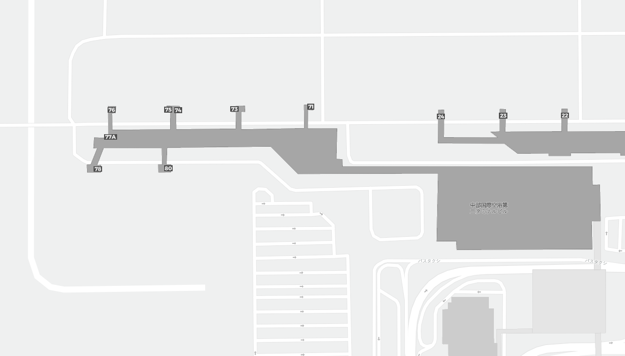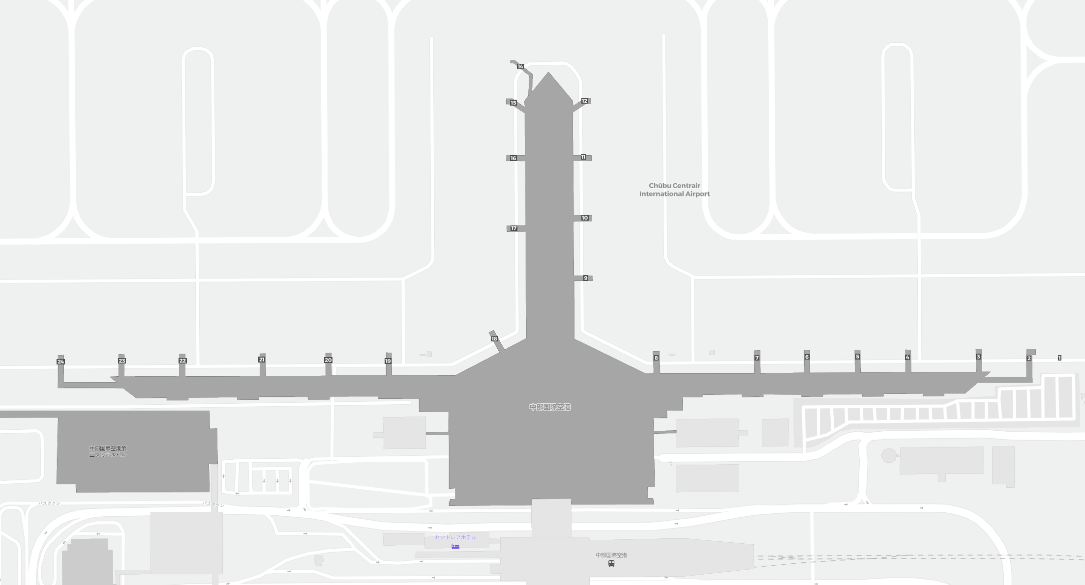 Dit is een inzoombare kaart van Nagoya (NGO). De kaart geeft je een overzicht van het buitenterrein met terminals, parkeerplaatsen, en op sommige luchthavens ook details over gates, autoverhuur en andere voorzieningen bij inzoomen.