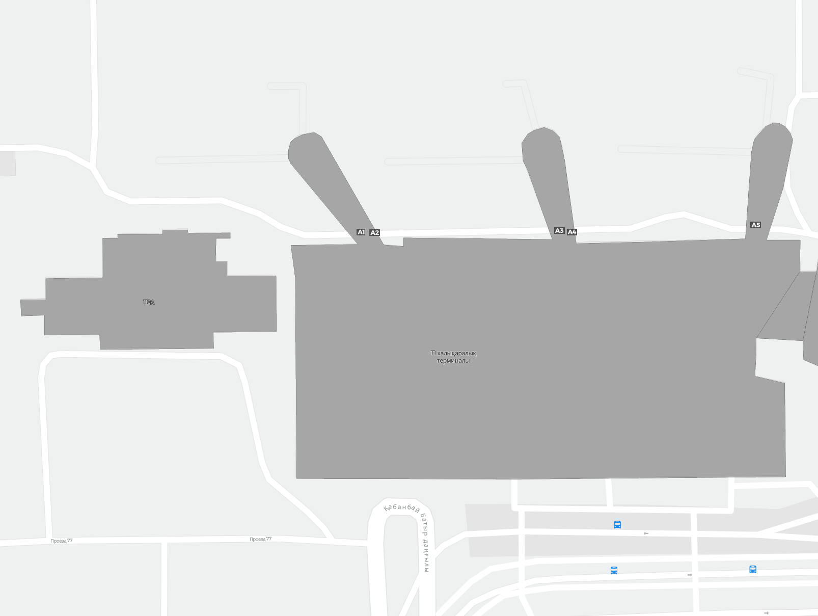 Dit is een inzoombare kaart van Astana (stad) (NQZ). De kaart geeft je een overzicht van het buitenterrein met terminals, parkeerplaatsen, en op sommige luchthavens ook details over gates, autoverhuur en andere voorzieningen bij inzoomen.