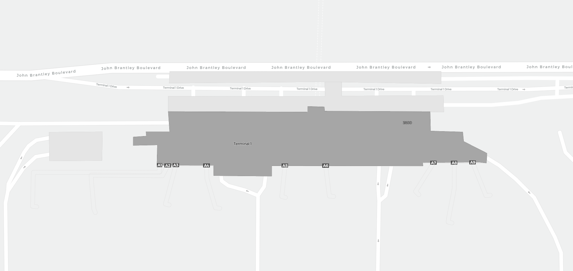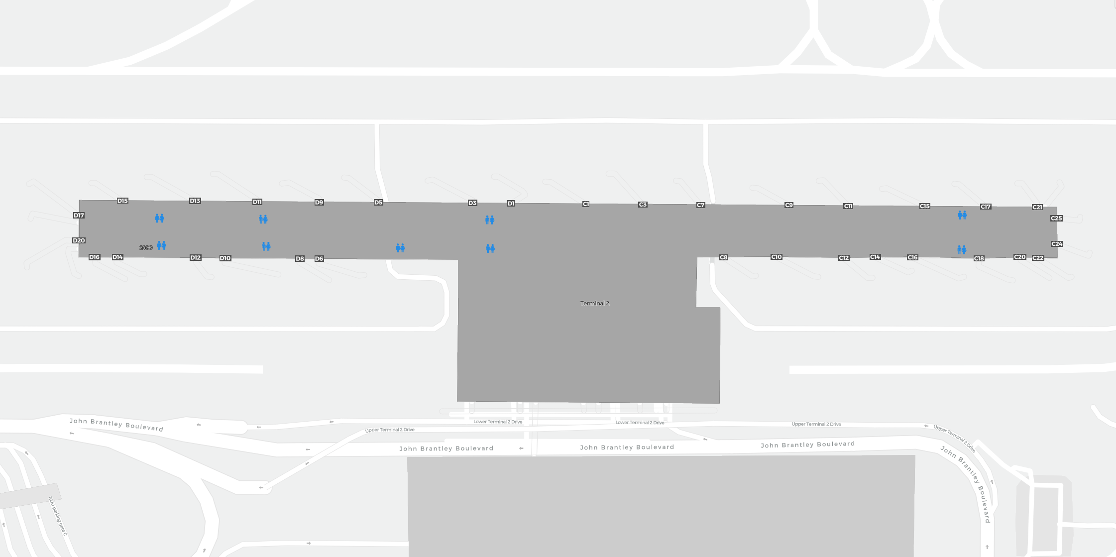 Dit is een inzoombare kaart van Raleigh (RDU). De kaart geeft je een overzicht van het buitenterrein met terminals, parkeerplaatsen, en op sommige luchthavens ook details over gates, autoverhuur en andere voorzieningen bij inzoomen.