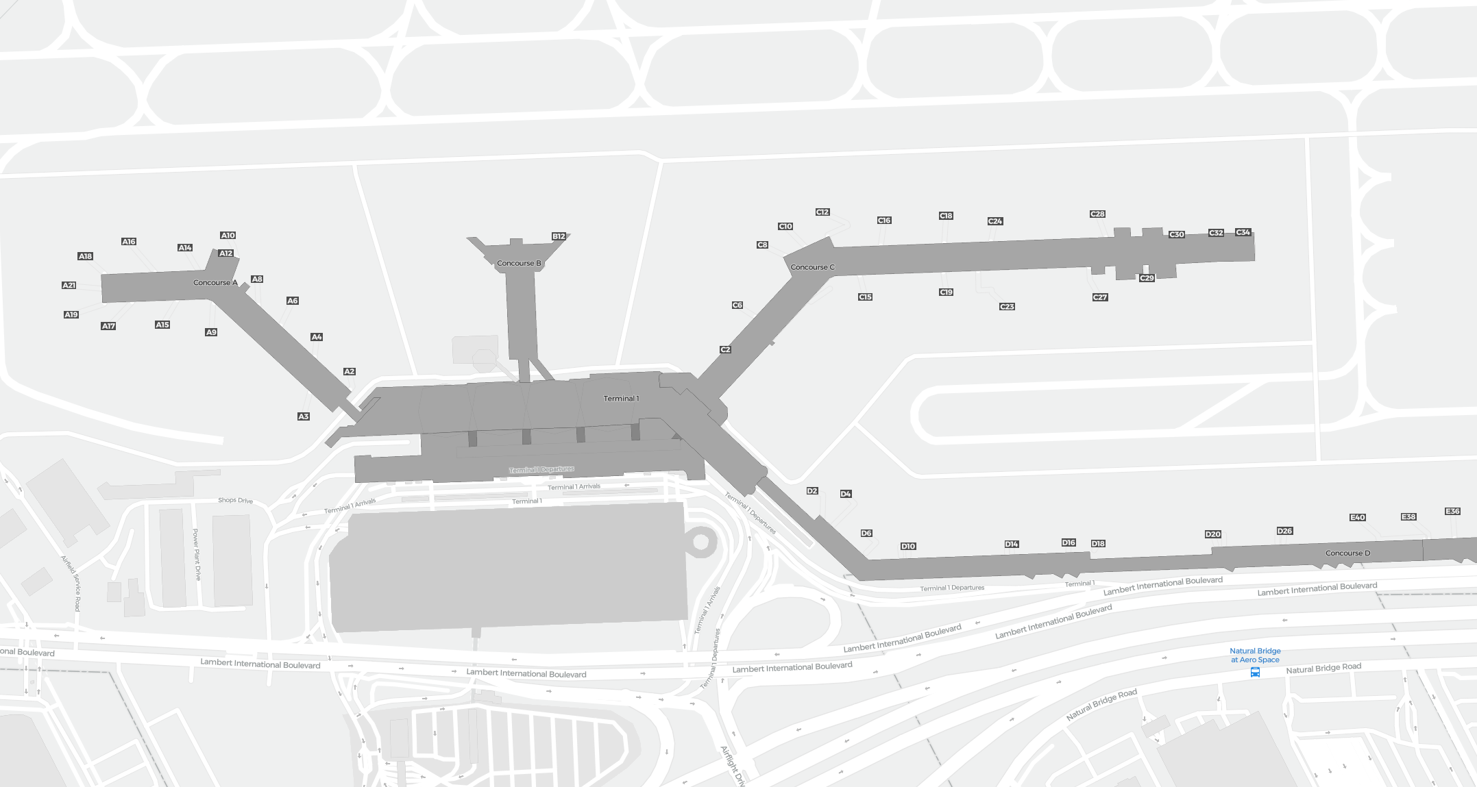 Dit is een inzoombare kaart van Saint Louis (STL). De kaart geeft je een overzicht van het buitenterrein met terminals, parkeerplaatsen, en op sommige luchthavens ook details over gates, autoverhuur en andere voorzieningen bij inzoomen.