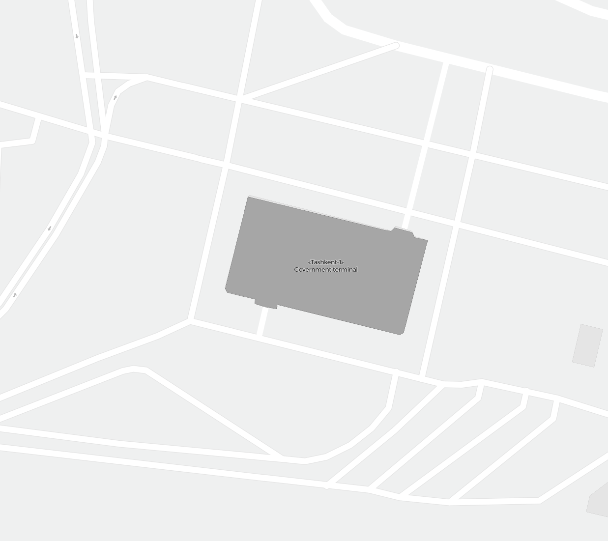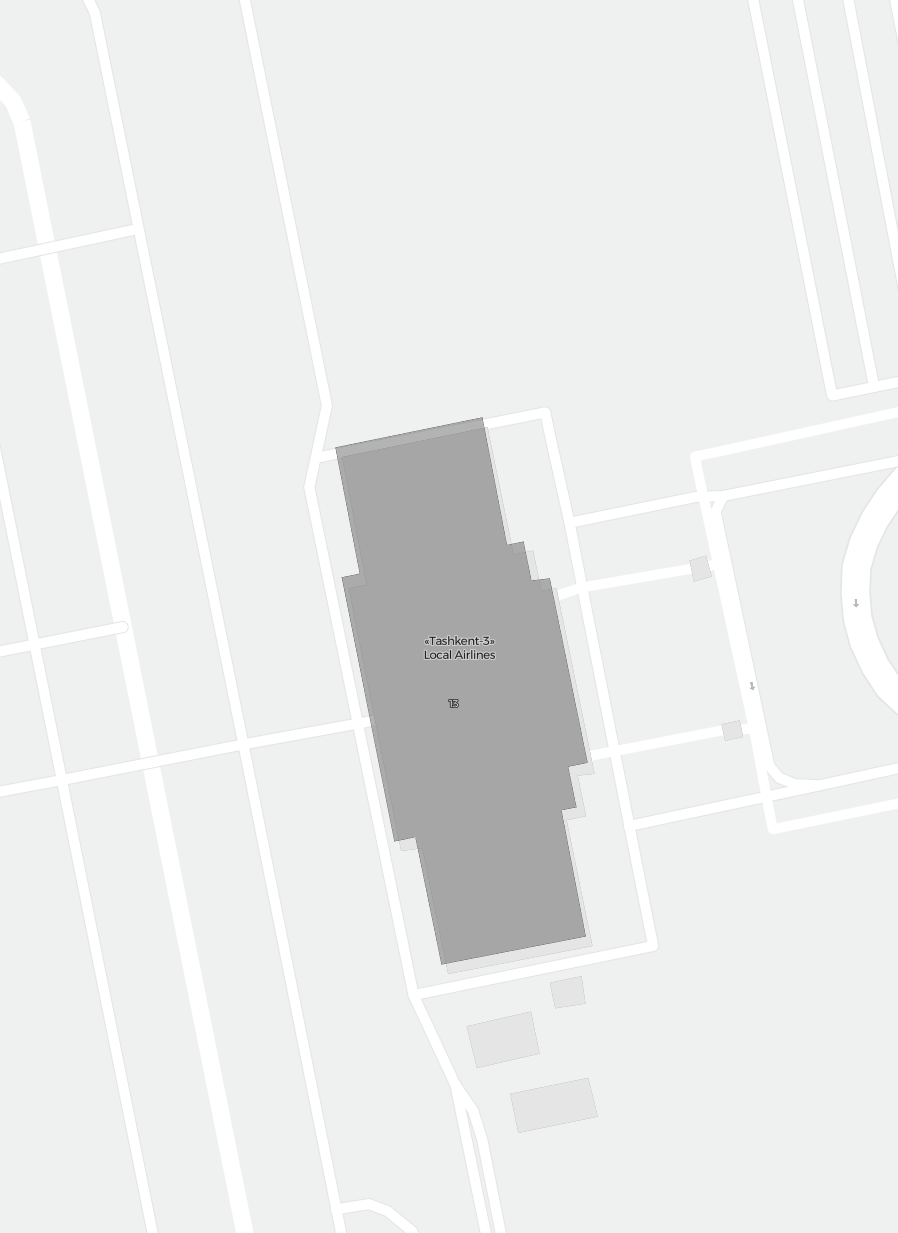 Dit is een inzoombare kaart van Tasjkent (TAS). De kaart geeft je een overzicht van het buitenterrein met terminals, parkeerplaatsen, en op sommige luchthavens ook details over gates, autoverhuur en andere voorzieningen bij inzoomen.