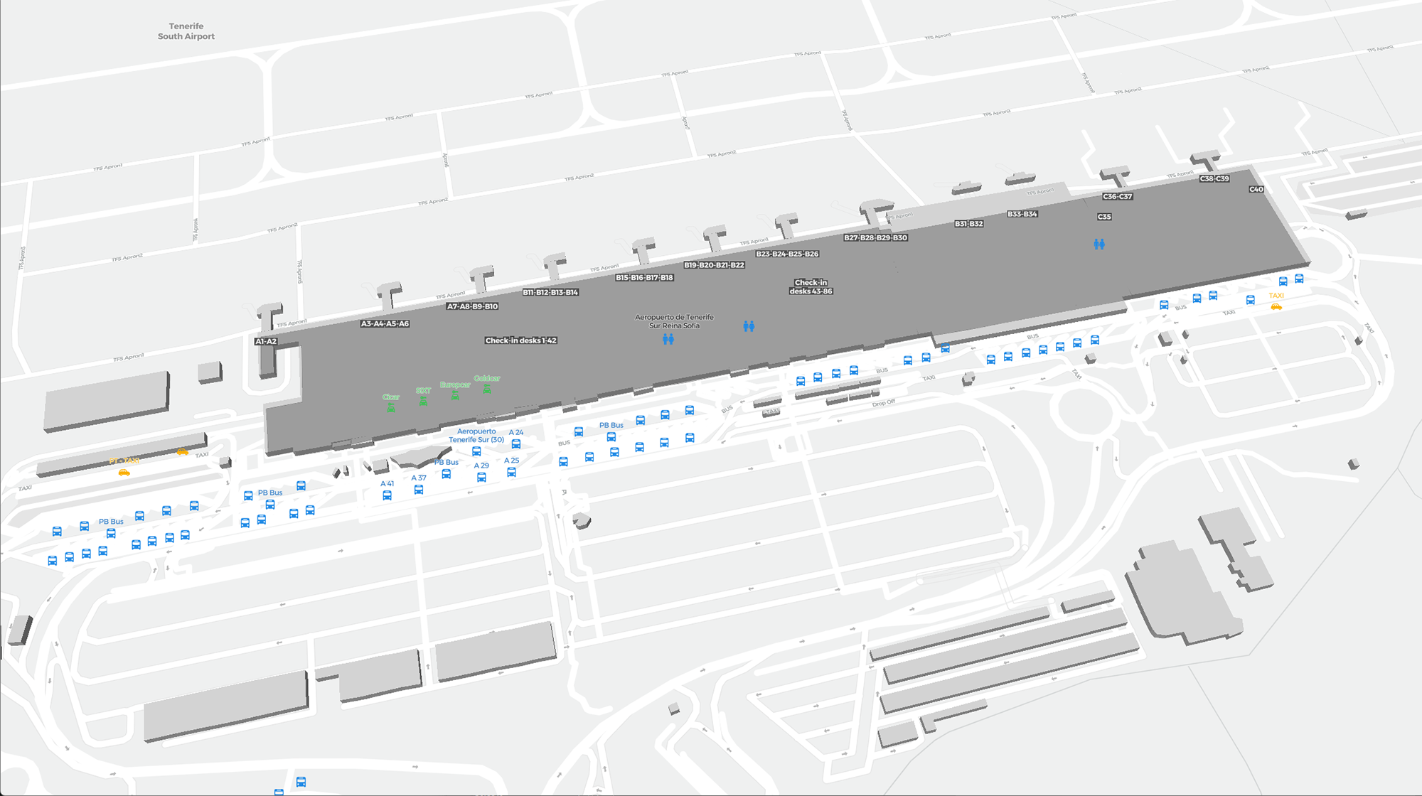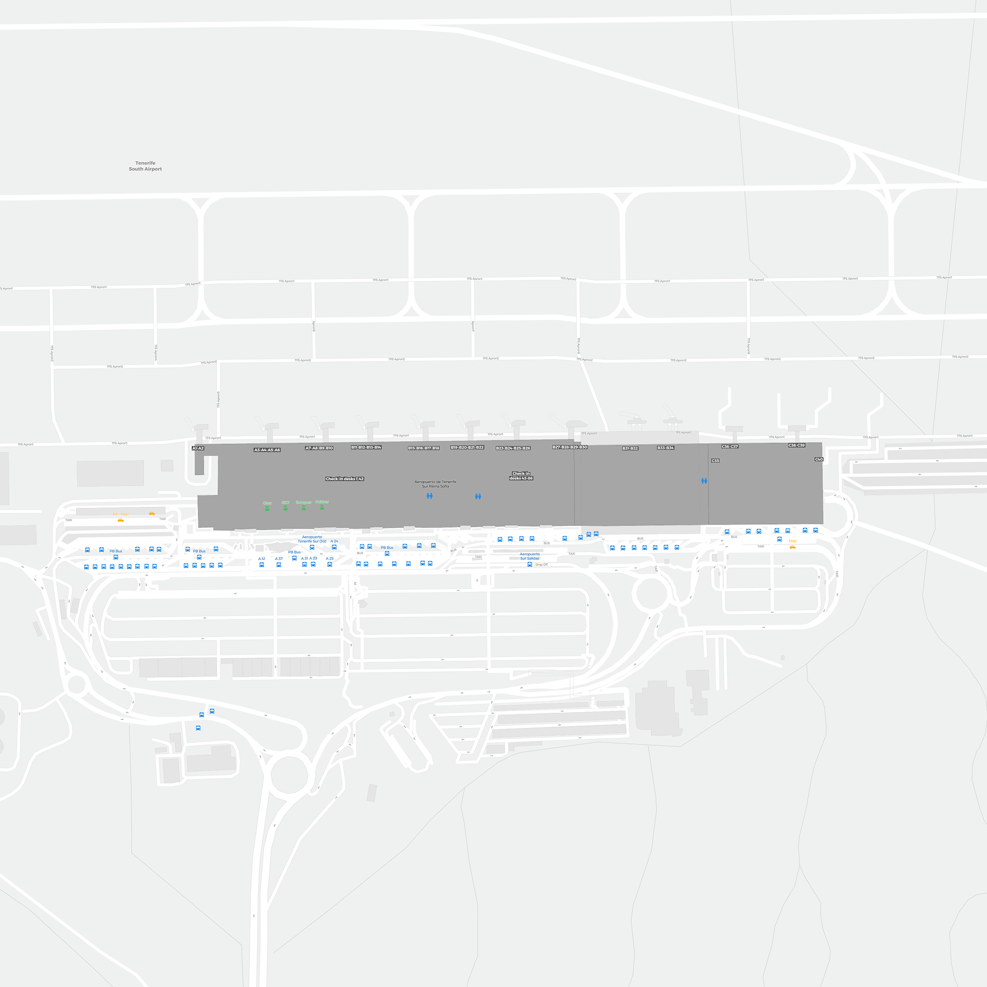 Dit is een inzoombare kaart van Granadilla de Abona (TFS). De kaart geeft je een overzicht van het buitenterrein met terminals, parkeerplaatsen, en op sommige luchthavens ook details over gates, autoverhuur en andere voorzieningen bij inzoomen.